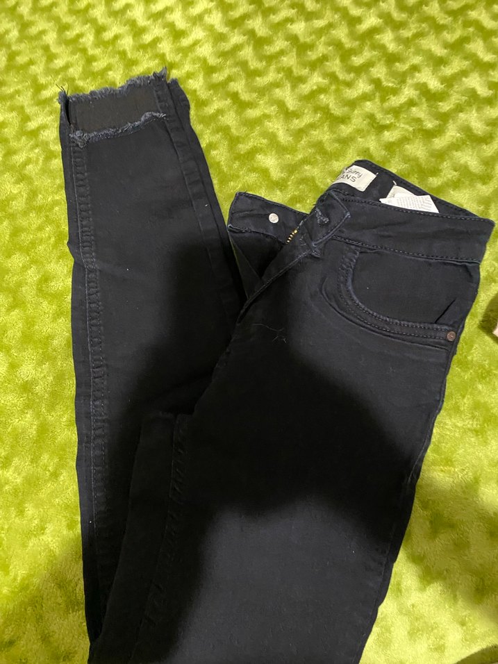 Dar kesim, yeşil renkli baskılı denim jean. Fermuar detaylı, midi boyda, sokak modasına uygun rahat bir model. W25 beden.
