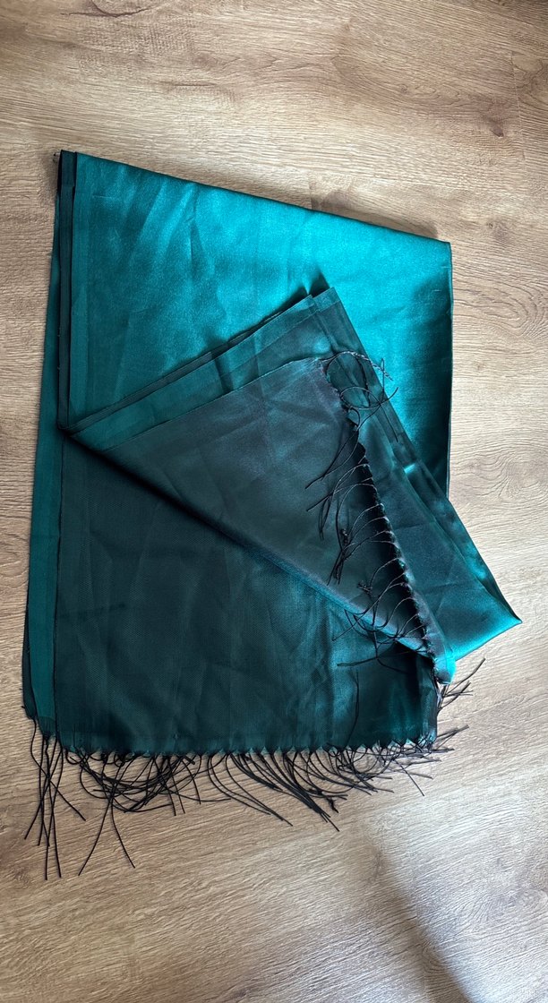 Kadınlar için zümrüt yeşil renginde, ipek görünümlü, drapeli bohem tarzda şal. Uçlarında ince püsküllerle retro ve hippie havası katıyor.