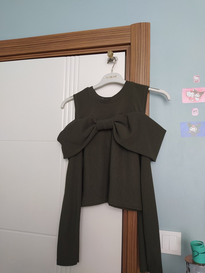 Kadınlar için uzun kollu, bisiklet yakalı ve bol kesim olan bu bluz, büyük fiyonk detayıyla dikkat çekiyor. Koyu yeşil sentetik kumaştan üretilmiştir.