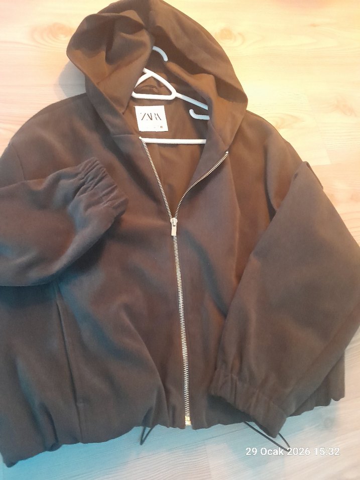 Yumuşak ve sıcak kumaştan, kapüşonlu ve fermuarlı kahverengi bol kesim ceket. Uzun kollu ve midi boyda, rahat sokak stiline uygun.