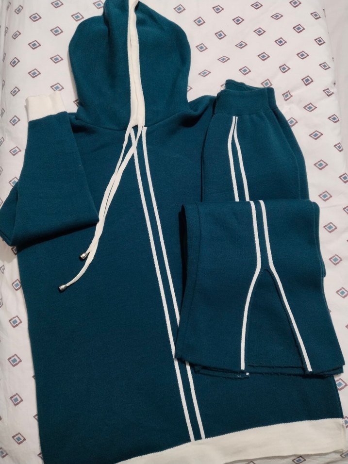 Kadınlar için koyu mavi renkli, kapüşonlu triko takımı. Yumuşak kumaştan, uzun kollu ve rahat kesimdir. Beyaz şerit detaylarıyla sportif bir görünüme sahiptir. ♀️