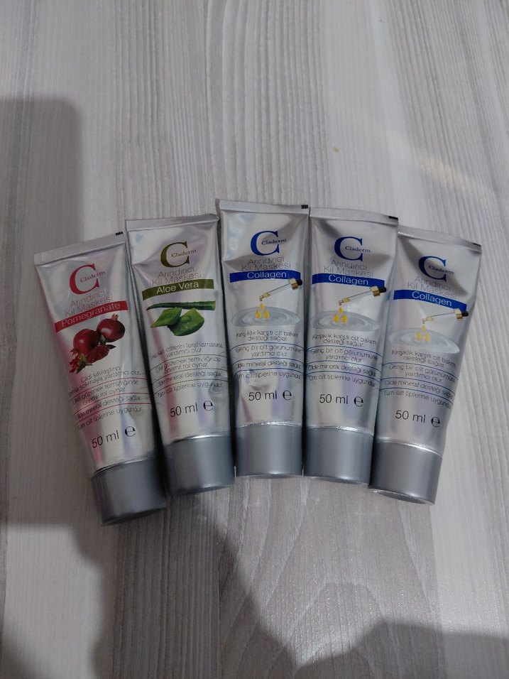 50 ml'lik beş adet cilt bakım ürünü seti. Kolajen ve aloe vera maskeleri içerir, cildi besler ve tazeler. Her tüp 50 ml.