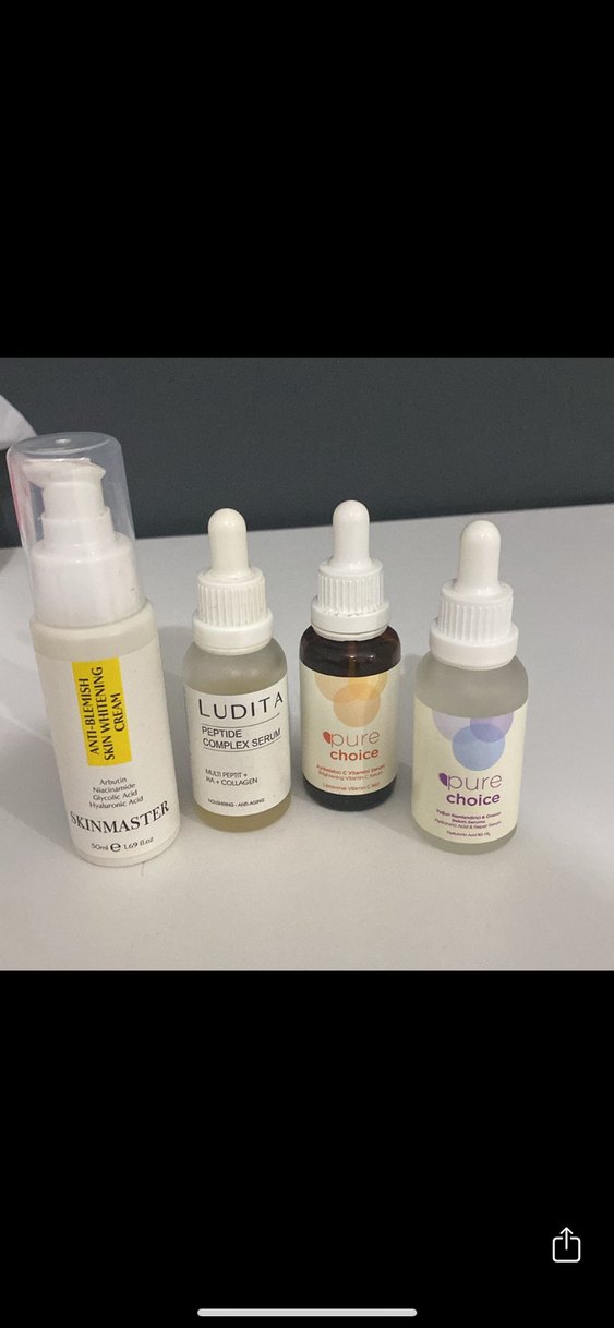 Skinmaster, Ludita ve Pure Choice markalarından cilt yenileyici krem ve anti-aging serumlar içeren set. Cilt kolajenini destekler. ✨ ürünün yarısı kullanıldı yarısı duruyor cok uygun fiyattan veriyorum 4 lu satılır