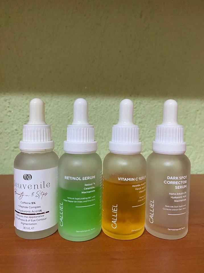 Retinol, vitamin C, koyu leke giderici ve kafeinli peptit kompleksi içeren 4'lü kadın anti-aging serum seti.