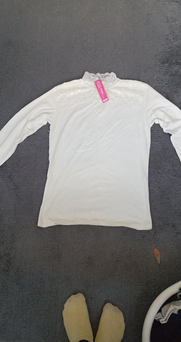 Beyaz uzun kollu, yuvarlak yakalı ve bol kesim kadın tişörtü, pamuklu yumuşak kumaştan, rahat sokak stili için. İnce fırfırlı yakası vardır.