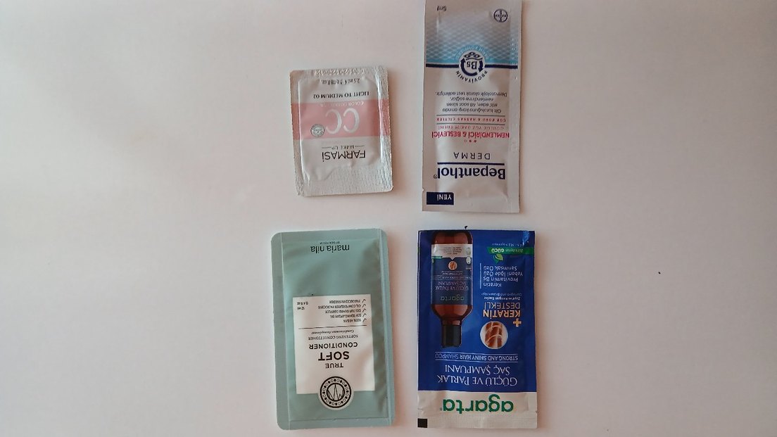 Bu set, CC krem, yüz temizleyici, saç kremi ve şampuan gibi çeşitli kadın cilt bakım ürünlerinin örnek paketlerini içerir.