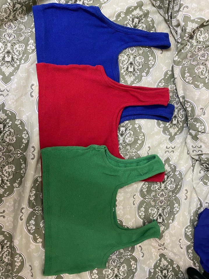 Mavi, kırmızı ve yeşil renklerde, desen içermeyen croplar Yumuşak kumaştan üretilmiştir, rahatlık sağlar,esnek