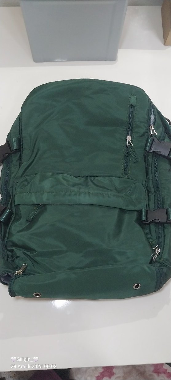 Koyu yeşil sentetik kumaştan yapılmış, fermuarlı cepleri olan, usb girişli canta