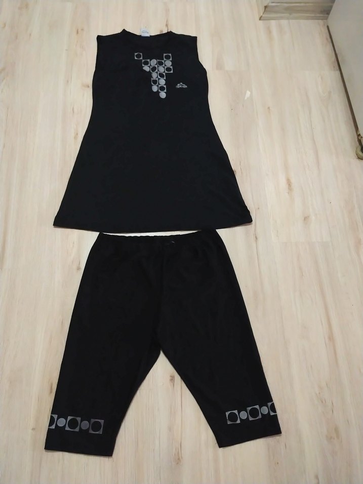 Kadınlar için kolsuz, fitted mini üst, renkli yuvarlak yakalı ve siyah kapri pantolonlu, yumuşak sentetik kumaştan mayo takımı. göğüs bölgesinde Ufak deforme vardır