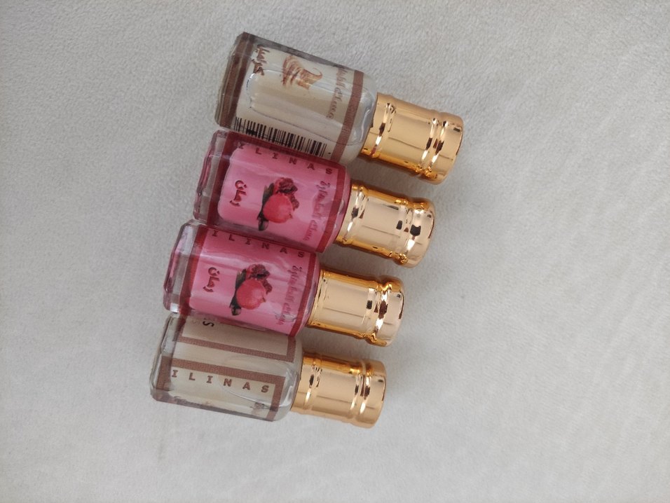 Altın kapaklı, küçük cam şişelerde çiçeksi ve klasik kokulara sahip dört adet kadın parfümü seti. Kadın erkek koku esans misk Musk al tahara beyazlatıcı leke kremi magdolin Suriye İran kremi Arap kremi
