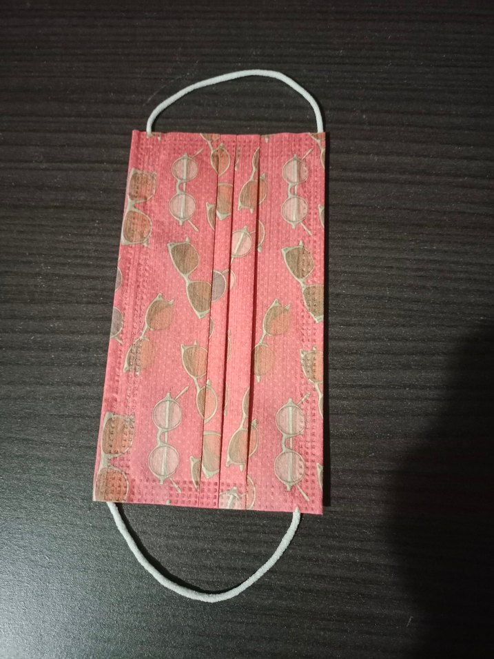 Pembe renkli, üzerinde güneş gözlüğü desenleri bulunan kadınlar için tek kullanımlık maske. Kulak askılıdır. Elimde çok sayıda çeşitleri desenlede maske var, toplu alımlarda fiyatta pazarlık yaparım, fiyatı temsili