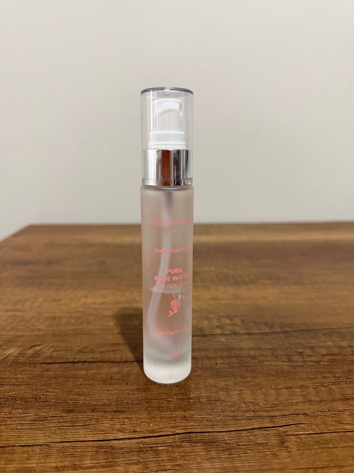 Şeffaf buzlu şişede pompalı başlığa sahip, saf gül suyu içeren kadınlar için tonik. Cildi nazikçe nemlendirir ve ferahlatır.