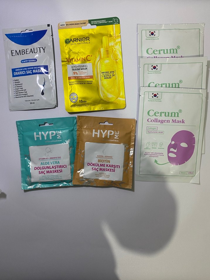 Aloe vera ve biotin saç maskeleri, kolajen yüz maskeleri ve C vitamini aydınlatıcı serum maskesi içeren saç ve yüz maskeleri seti.