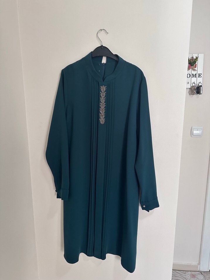 Zümrüt yeşili renkte, uzun kollu, yüksek yakalı piliseli ve işlemeli detaylı tunik. İpek gibi kumaştan, sade ve mütevazı tarz için uygun, ofis kullanımı için ideal.
