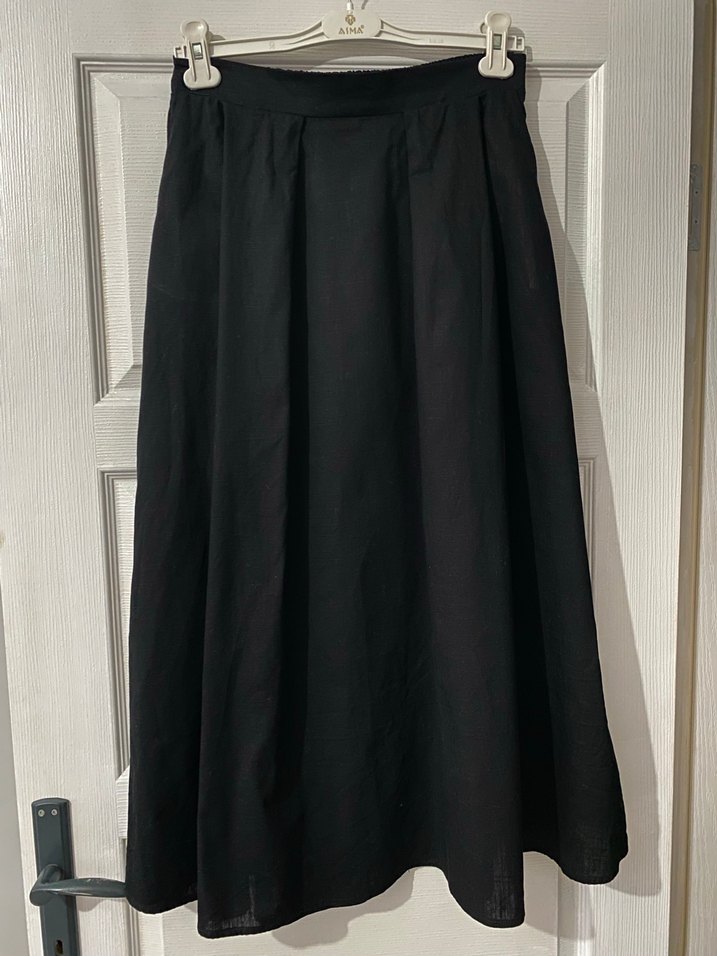 Keten kumaştan, drapeli ve bol kesim siyah uzun etek. Minimalist ve goth tarzına uygun, ofis kullanımı için ideal. Bedeni yanlış aldım bu sebeple yeni hali ile satıyorum astarı yok astar giymek şart keten kumaşlı kusuru yok yenidir