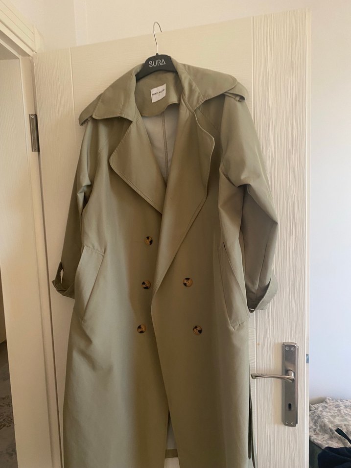Haki renkli, düğmeli uzun kadın trençkot. Notch yakalı, bol kesim ve uzun kolludur. Sentetik kumaştan, günlük rahat sokak stili için uygundur.