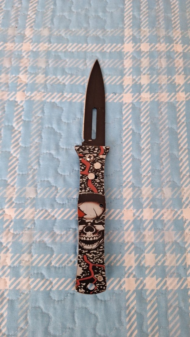 Kafatası desenli çok renkli sapı ve keskin bıçağı olan koyu renkli bir bıçaktır.