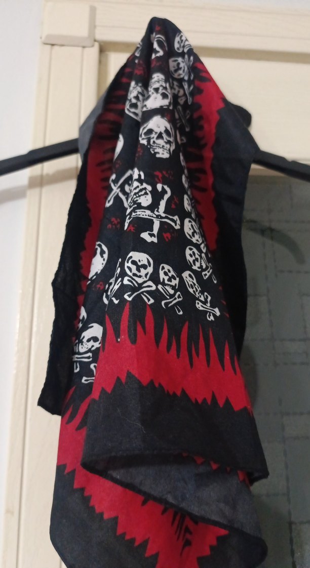 Koyu kırmızı, tekstil malzemeden yapılmış, drapeli ve gotik kafatası desenli şal. Bohem ve retro tarzlara uygundur.