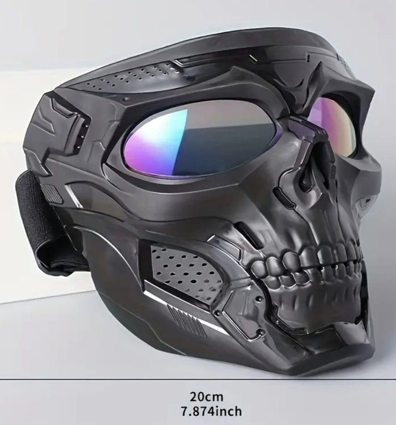 Bu siyah biker maske, kafatası desenine ve tokalı tasarıma sahiptir. Dayanıklı plastikten yapılmış, 20 cm (7.874 inç) ölçüsündedir ve koyu gotik rock punk havası verir. ️