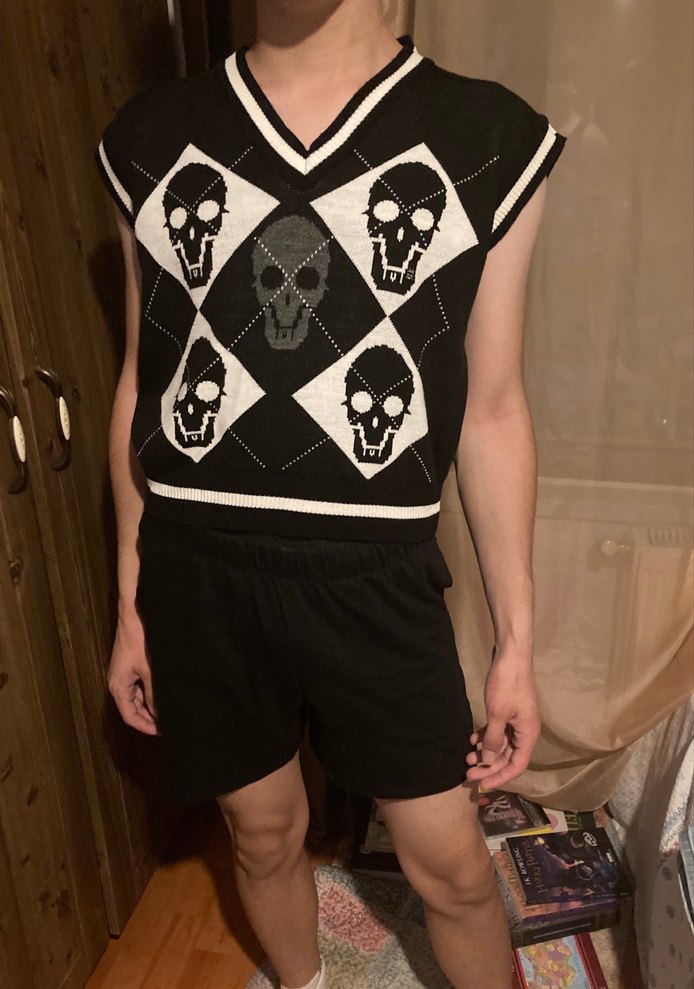 V yaka, siyah örme kumaştan, kafatası desenli, salaş kesim ve kolsuz gothic tarzda süveter.