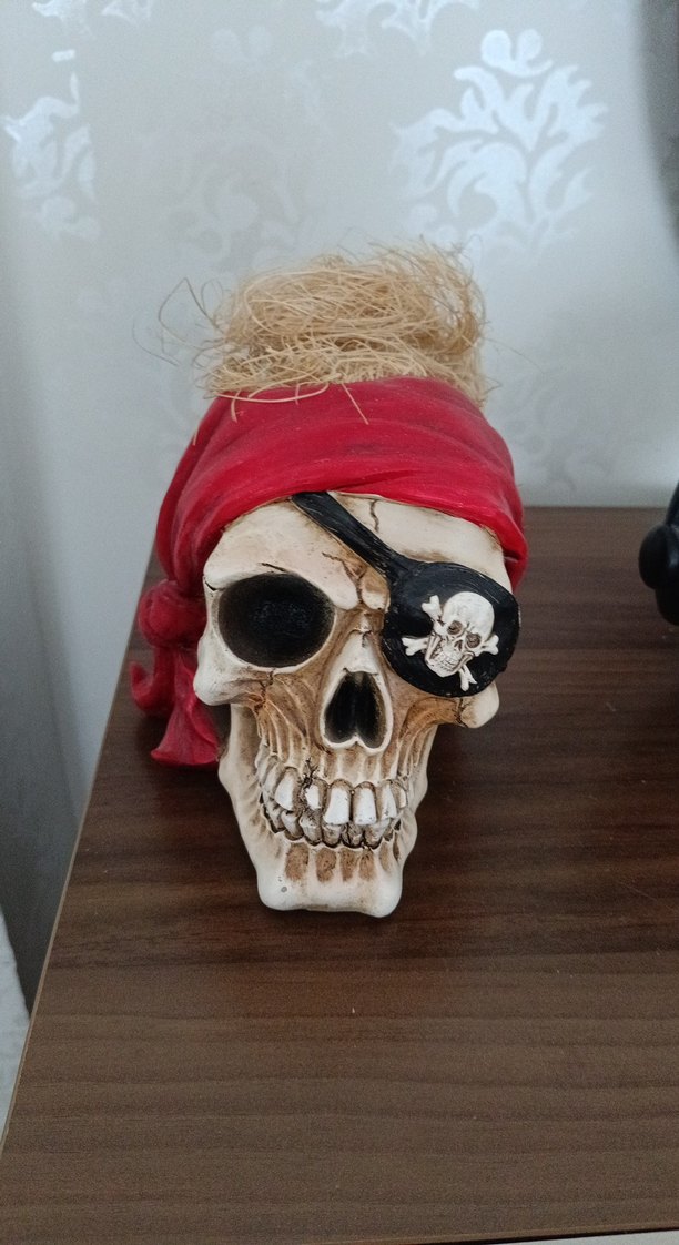 Kafatası figürin, üzerinde kafatası amblemi olan koyu renkli göz bandı ve kırmızı bandana ile üzeri saman benzeri malzeme kaplıdır. Detaylı koyu renklidir. ☠️