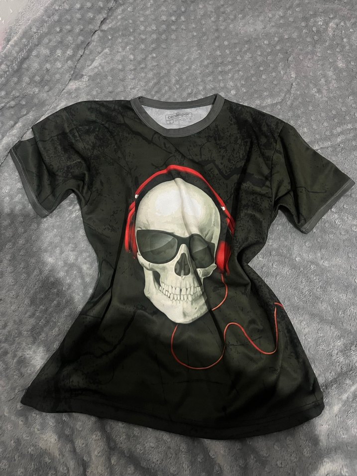 Kırmızı kulaklıklı ve güneş gözlüklü kafatası baskılı siyah tişört, yumuşak ve rahat kumaştan üretilmiştir.