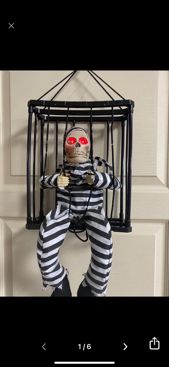 Kafesi içinde, kırmızı ışıklı gözlere sahip kafatası figürlü koyu gri aksiyon figürü. Çizgili mahkum kıyafeti giymiş, korkutucu görünüme sahip.