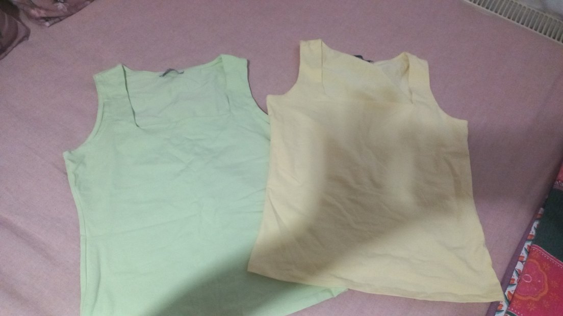 Beyaz ve açık yeşil renklerde, kolsuz ve yumuşak kumaştan yapılmış içlik atletler.