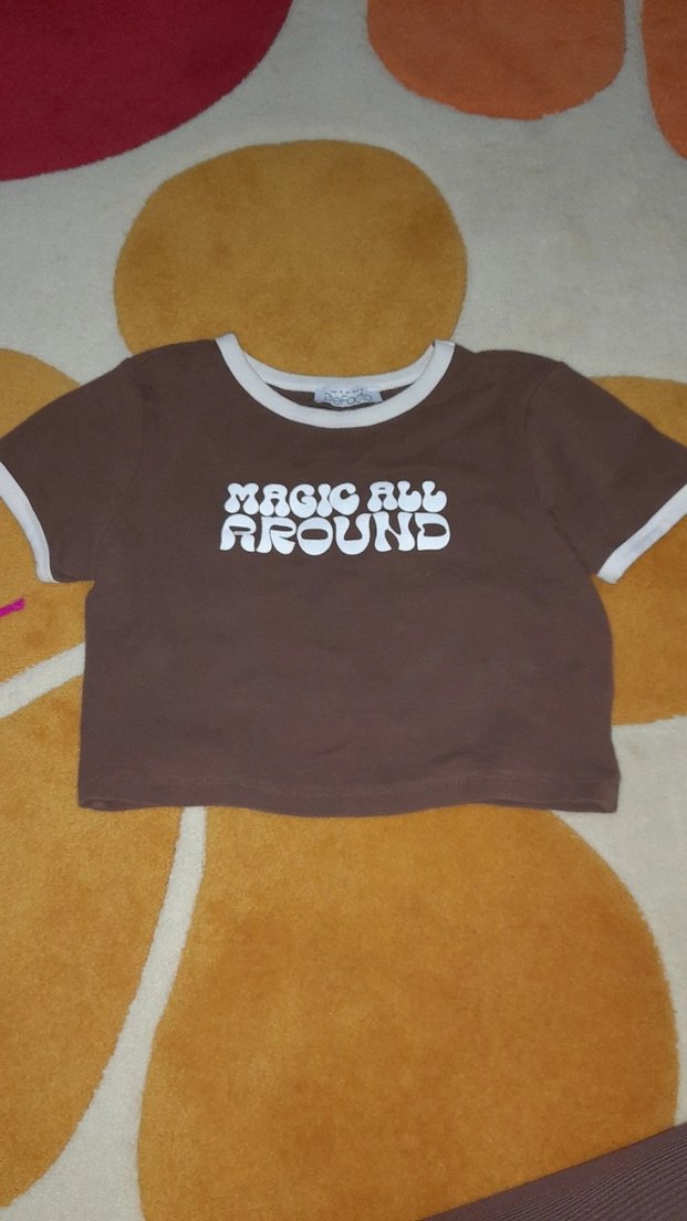 Kahverengi pamuklu kumaştan, crop, bisiklet yaka, baskılı yazılı, dar kesim kadın crop'ı. Sokak stili için uygun