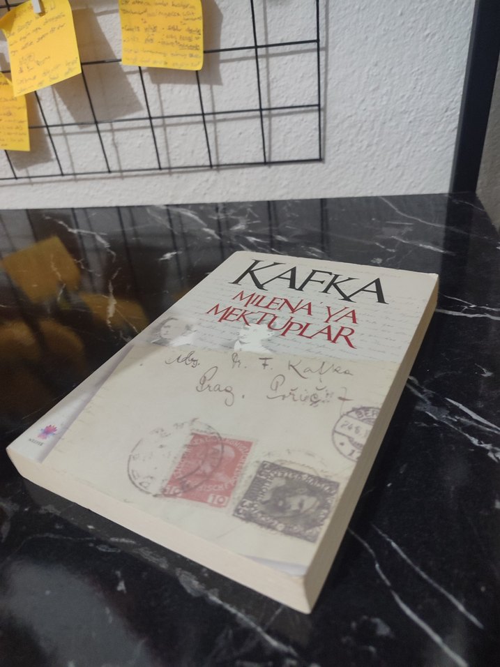Kafka'nın 'Mektuplar' kitabı, eski posta pulları ve el yazısı içeren kapağıyla mektup koleksiyonunu vurgular.