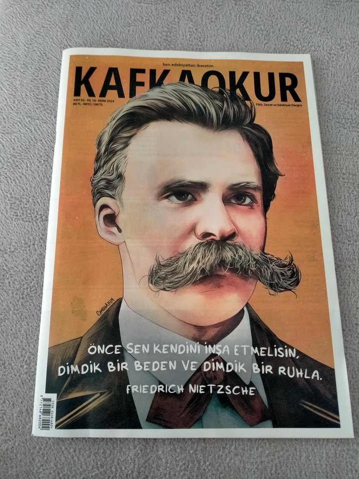 Kafkaokur dergisi kapağında Friedrich Nietzsche yer alıyor. Kendini inşa etmek ve ruh üzerine alıntı içeriyor. İlgi çekici illüstrasyon mevcut.