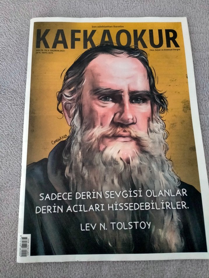 Kafkaokur dergisi, Lev N. Tolstoy'un kapağı ve derin sevgi ile acı üzerine sözü ile edebi içerikler sunuyor.
