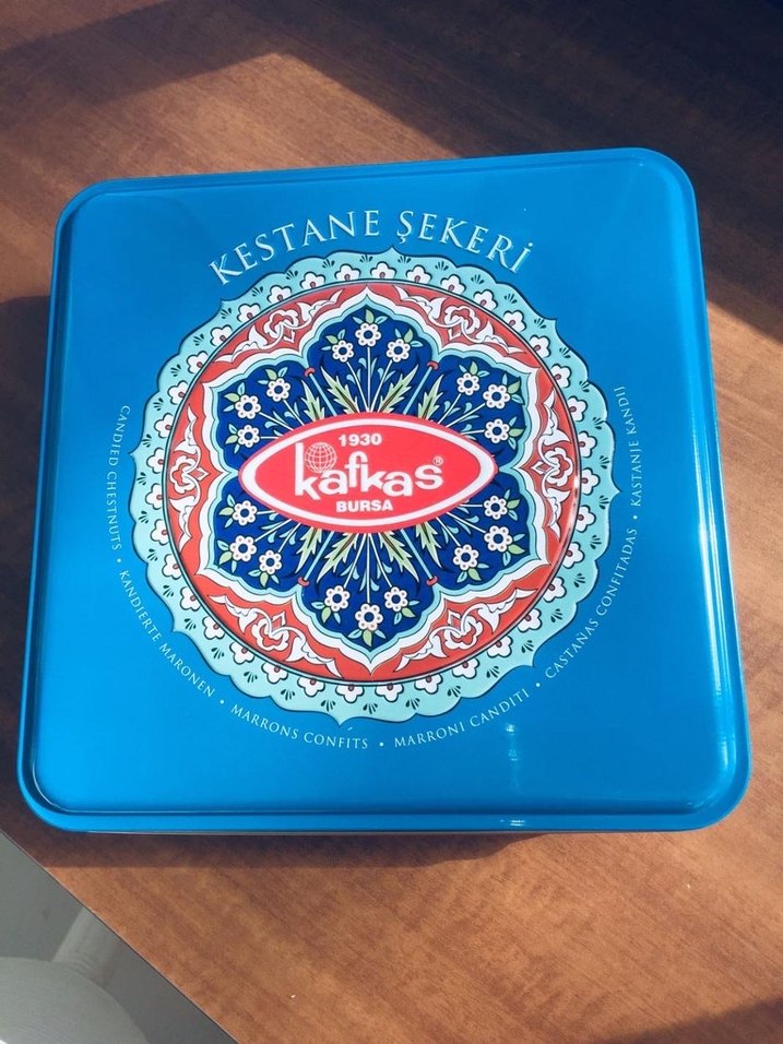 Kafkas markalı kestane şekeri için kullanılan, koyu mavi renkli, geleneksel Türk desenli metal kutudur. Sağlam ve dekoratiftir. teneke boş kare kutu,temiz ve sorunsuz.eni ve boyu 19 cm ,yani kare ,derinliği ise 4.5 cm