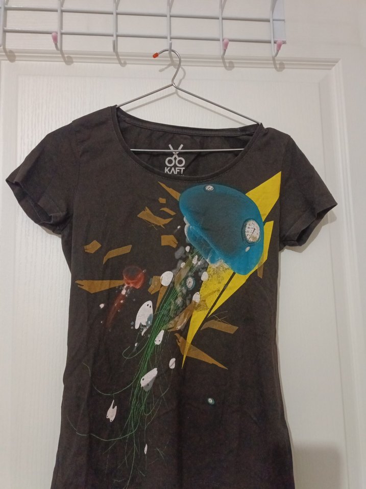 KAFT marka, %100 pamuklu kumaştan üretilmiş print detaylı kadın tişörtüdür. XS/S bedene sahip olup slim fit formdadır. Ön yüzündeki baskı nedeniyle ters çevrilerek hassas programda yıkanması ve düşük ısıda ütülenmesi önerilir. 50–52 kg üzeri kullanıcılar için dar kalıp gelebilir. Penyesi kaliteli pamuktan olup herhangi bir defosu veya tüylenmesi bulunmamaktadır. Günlük kullanımlar için rahat ve ideal bir parçadır.