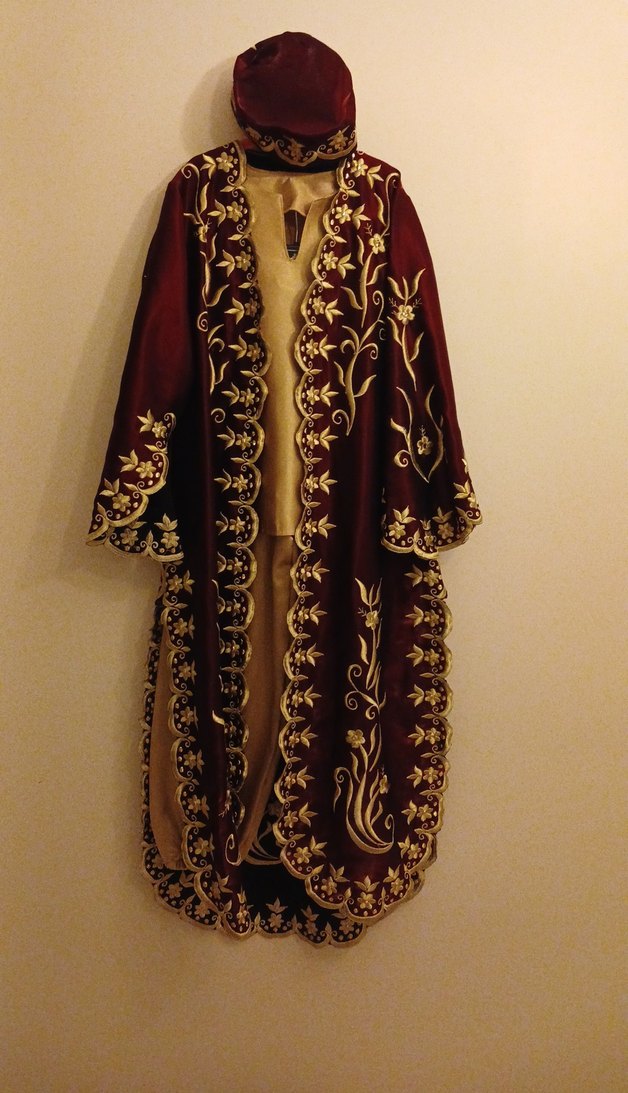 şarvali kaftan koyu kırmızı ici hardal renginden açık sarvali ve sıfır üst mevcuttur şapkası ve terlikleri sıfır üründür S/M beden kaftanin boyu 1.30. eni 40 cm için şarval ile üst salvarin boyu 95 cm. bel kısmı lastikli 31 cm ...üst 62 boy 45 en