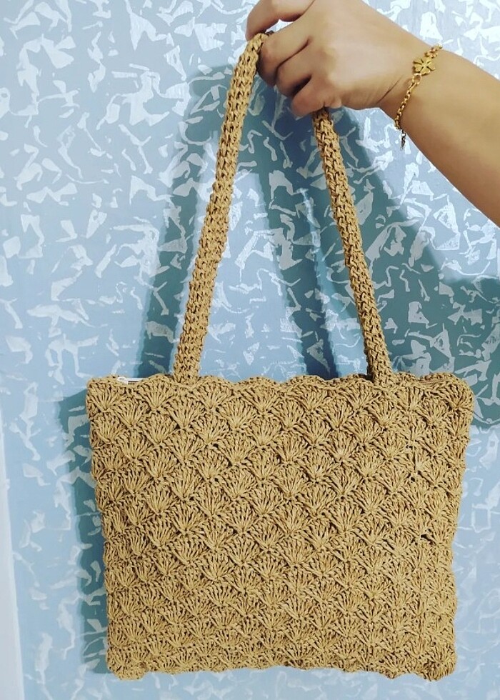 Kağıt ip ile örülmüştür. Astarlı ve fermuarlı. Enxboy 35x30 kol 29