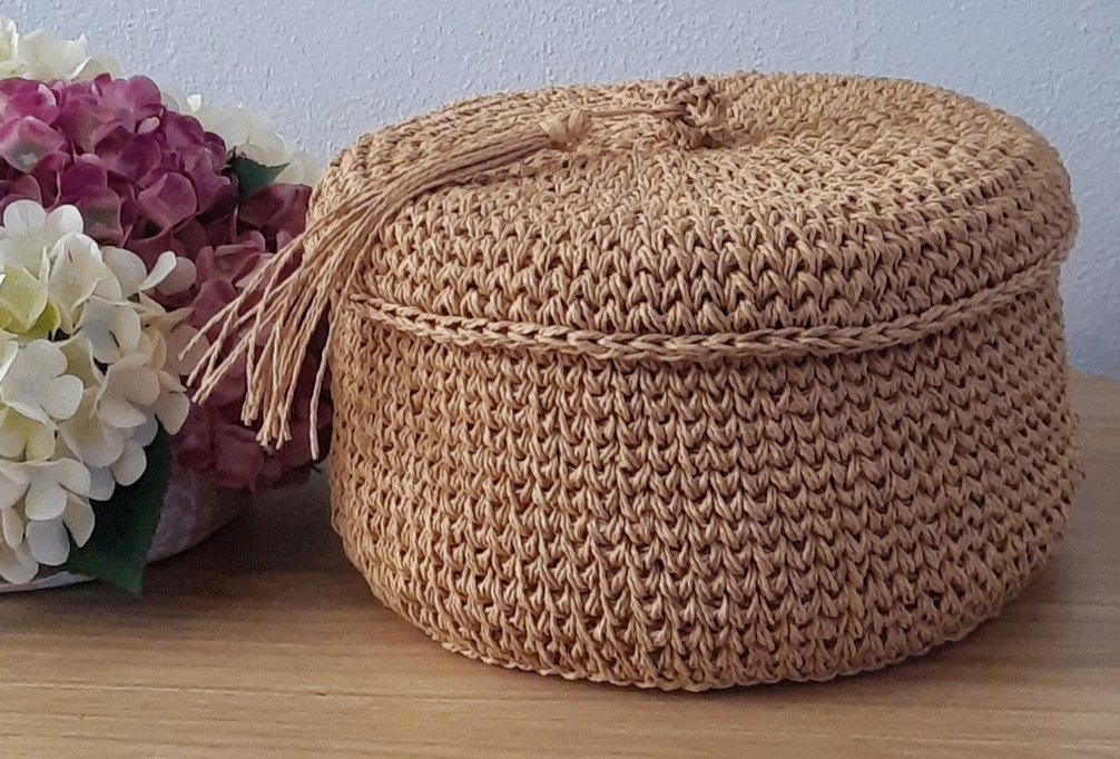 Kapağı ve püskül detayı olan açık bej örgü saklama sepeti, küçük eşyalar için uygundur.