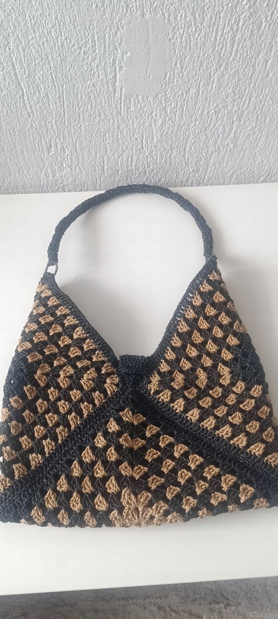 kağıt ipten örgü bohem tarzda, retro esintili kadın çantası. Koyu renkleri ve el işi görünümüyle günlük kullanıma uygundur.