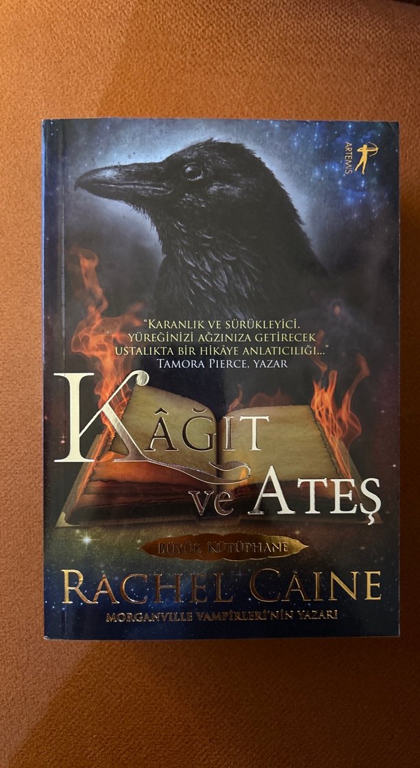 Rachel Caine'in "Kâğıt ve Ateş" adlı kitabı, karanlık ve sürükleyici bir hikaye sunar. Kapakta gizemli bir kuzgun ve yanan bir kitap yer alır.