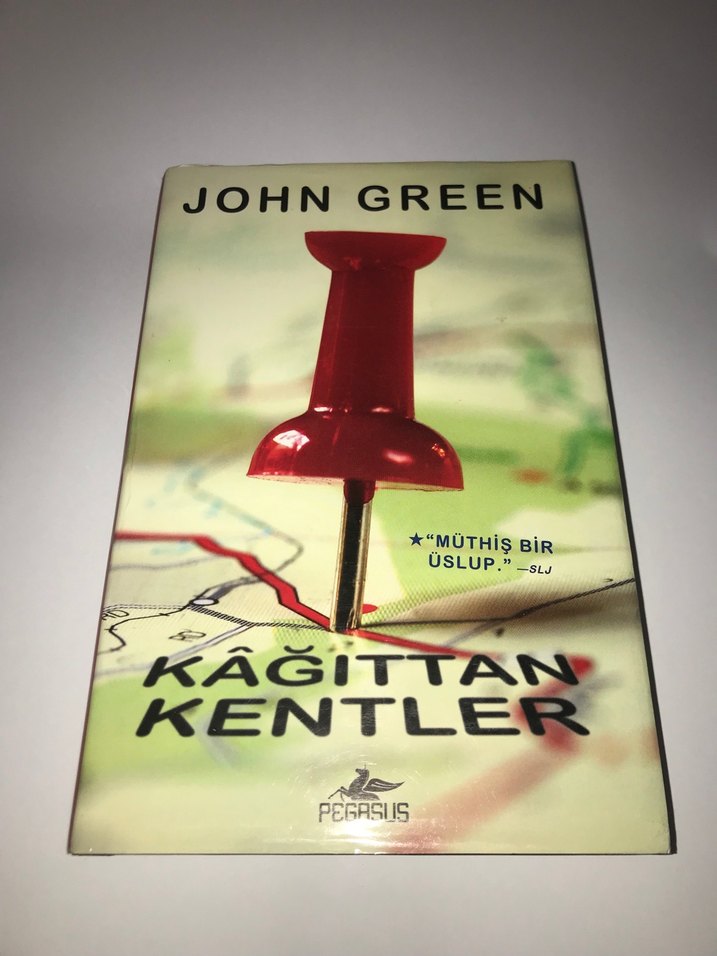 John Green'in 'Kağıttan Kentler' adlı romanı, kapağında kırmızı bir raptiye bulunan harita görseliyle Pegasus tarafından yayımlandı. Fotoğraflarda göründüğü gibidir.