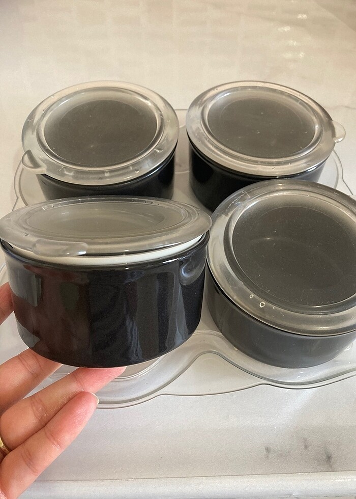 Kaseler porselendir. Alt tepsisi ve kapakları plastikdir. 1, 2 kez kullanılmıştır hiç bir defo yoktur.
