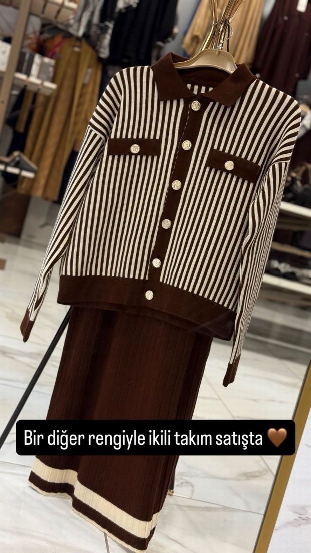 Kahve Çizgili Gold Düğmeli İkili Takım Yumuşak Triko