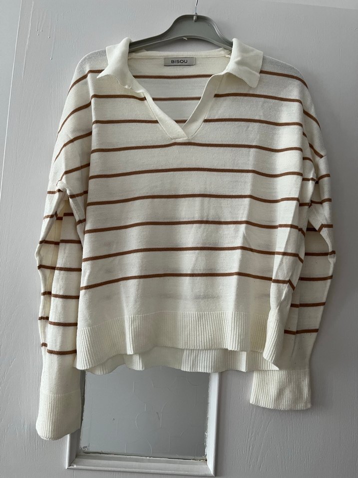 Kahve çizgili, yakalı ve uzun kollu pamuklu ince triko kazak. Rahat kesimi standart bedeniyle rahatlıkla kullanabilirsiniz.1 kere giyildi