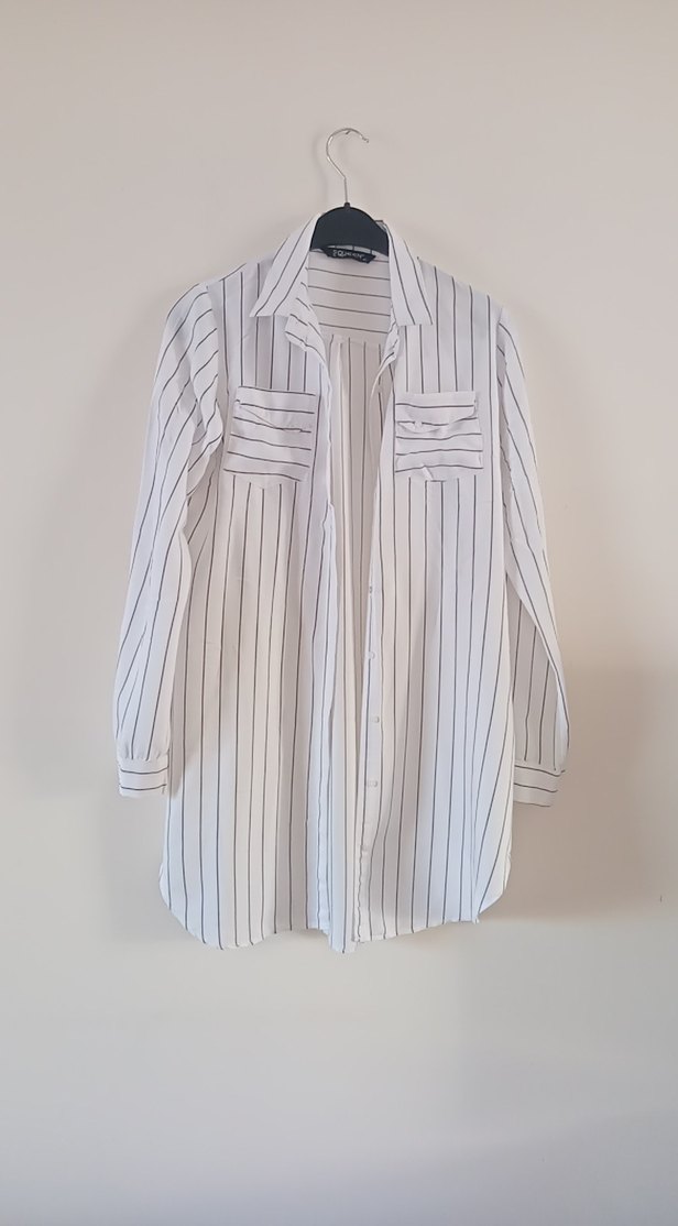 kahve çizgili, uzun kollu, düğmeli ve yakalı keten gömlek. Midi boy ve rahat kesim, günlük kullanıma uygun. kollarında düğmesi var istenirse kollar katlanıp düğmelenebilir. oval kesim tunik tarzında kol uzunluğu 64 cm omuzdan aşağıya kadar en uzun yeri 84 cm omuzdan aşağıya kenar kısmı beline kadar olan kısa kısmı72 santimetre