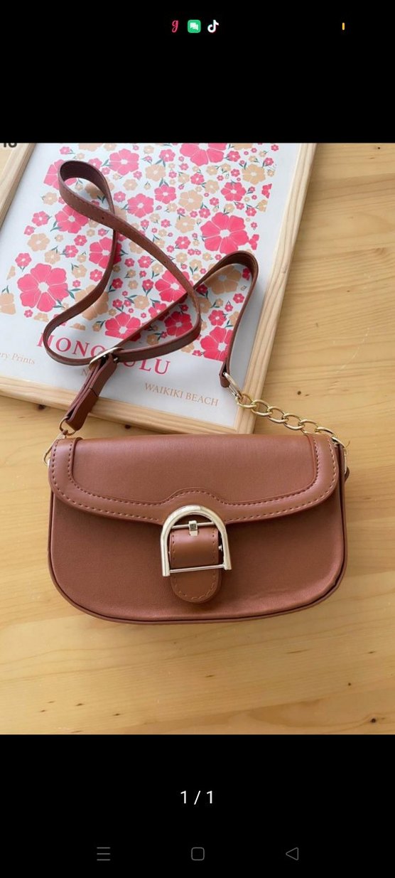 Kullanılmadı Kahve deri kadın çanta, tokalı kapak ve ayarlanabilir askıya sahip. Modern klasik tasarımıyla günlük kullanıma uygundur.