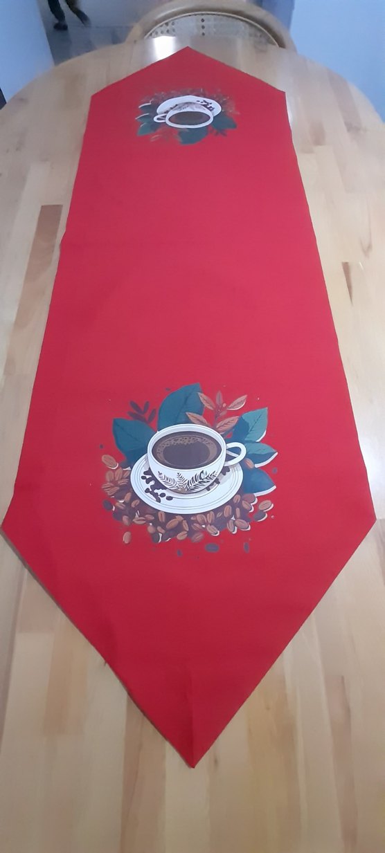 Kırmızı masa örtüsü, üzerinde kahve fincanı, yaprak ve kahve çekirdeği baskısıyla sıcak bir görünüm sunar. ☕