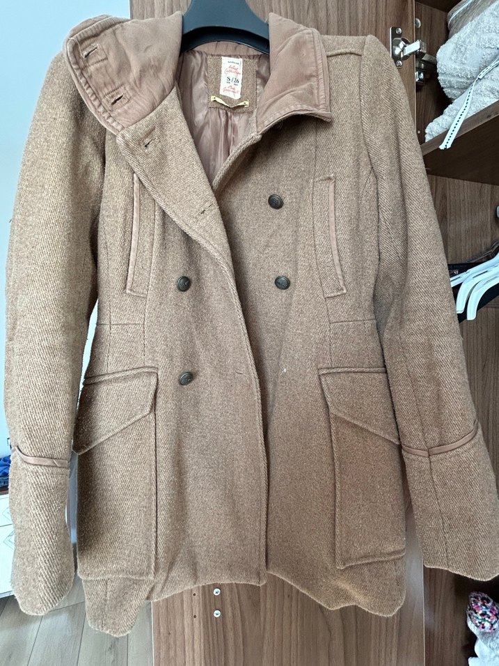 Kahve renk, düğmeli, normal boy midi yün kaban. Uzun kollu ve regular fit, rahat sokak stili için uygun.