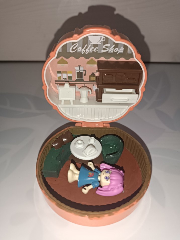 kahve dükkanı temalı mini oyuncak seti. İçinde küçük masa, sandalyeler ve pembe saçlı bir bebek ve birde arabası bulunur. ikisininde hiçbir sorunu yoktur kafenin içindeki çekmece açılabiliyor. gorseldeki herşey dahildir.daha fazla oyuncaklar için hesabima bakabilirsiniz✨