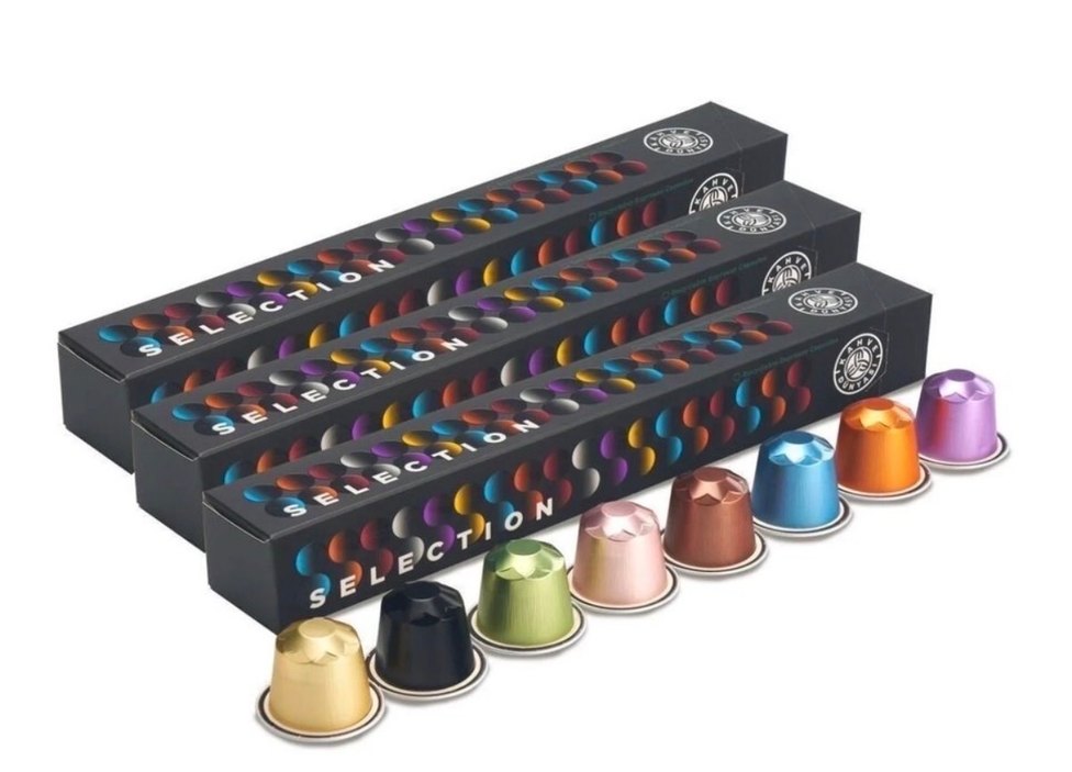 Farklı aromalara sahip koyu çok renkli kahve kapsülleri seti. Çoğu kahve makinesi ile uyumludur ☕️. 30 adet