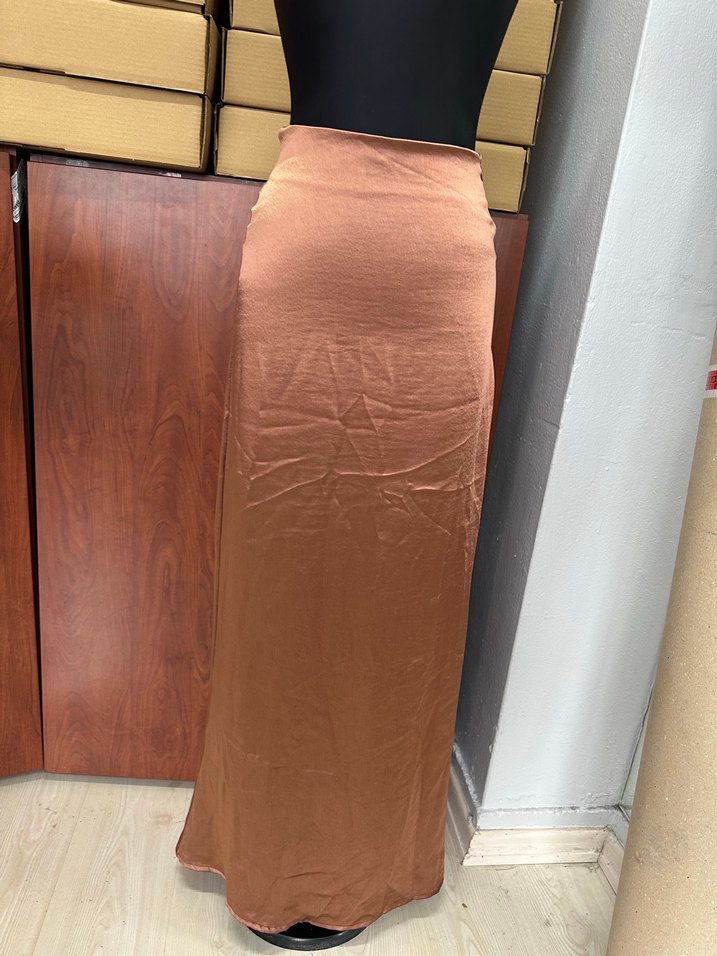 Kahve renkli, parlak ve ipeksi kumaştan yapılmış uzun etek. Regular kesim ve minimal bohem tarzıyla günlük kullanıma uygundur.